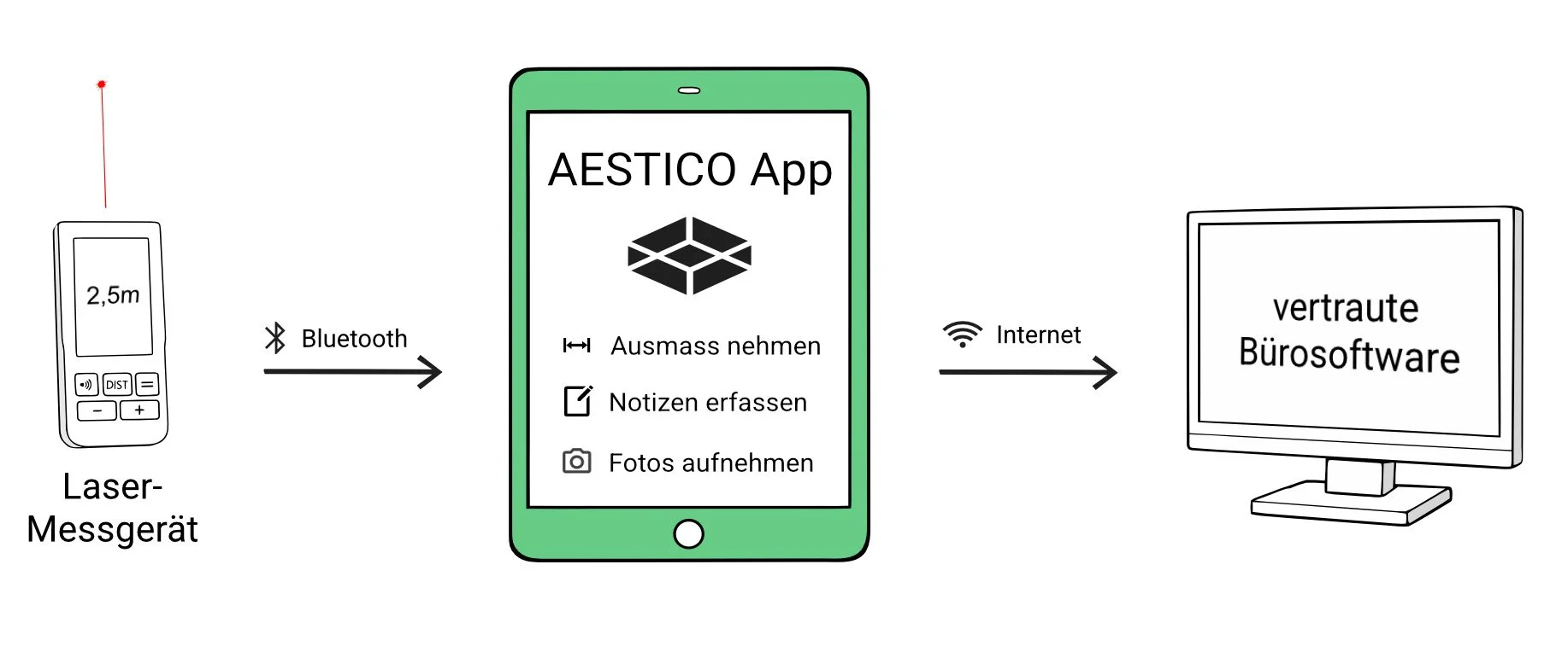 Die App lässt sich auf einem herkömmlichen Tablet installieren und mit üblichen Hand-Lasermessgeräten per Bluetooth verbinden. Übers Internet werden Ausmass, Notizen und Fotos direkt aus der AESTICO-App an die vertraute Bürosoftware übertragen.